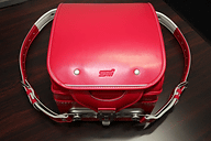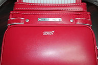 | チェリーレッドのランドセル。STIロゴの配色が、ブラックと異なっている | |