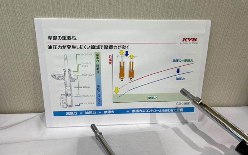 減衰力はこれまでどおりショックアブソーバーの構造やバルブによって決められるので減衰力特性は変わらないが、摩擦の低減によってカーブに現れない細かい上下動の制御の可能性ができた。