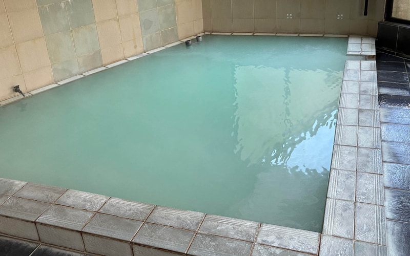 宿は猪苗代の中ノ沢・沼尻温泉にある大阪屋さん。街道筋に突然現れる温泉街で、加水も匂いもない白濁したお湯が特徴だ。日によって透明になることがあるという不思議な温泉で身体にも優しい。