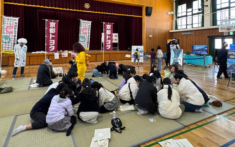 校庭や体育館にたっくさんの笑顔と楽しそうな声! 京都市立下鳥羽小学校で2026年1月10日に開催された「餅つき&かるた大会 車両展示会」に、交通安全教室の担当として参加してきました。相棒はいつもの交通安全応援ユニット「OKISHU(オキシュー)」の吉田由美さんです。