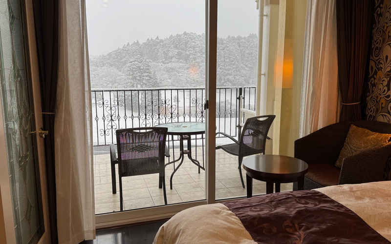 しかし。お昼頃から都心でも降り始めた雪は、東京湾アクアラインをわたり終えたくらいからどんどん強くなっていき、チェックインする頃には「ミラノ・コルティナ冬季オリンピック観戦に来ました〜」なんて言ってもバレないのではと思うくらい、真っ白な景色となっておりました。到着したらまずドッグランで愛犬と遊んで、次は娘とアスレチックを……などと思っておりましたが、無理して外に出て風邪でも引いたらいけませんので、お部屋でまったりとオリンピック観戦。愛犬と泊まれるのは本館とは別のスウィートヴィラという建物で、とっても広いリビングと寝室、テラスもあってゴージャスだったんです。たまにはこんなふうに、旅先で家族団らんするのもいいものですね。