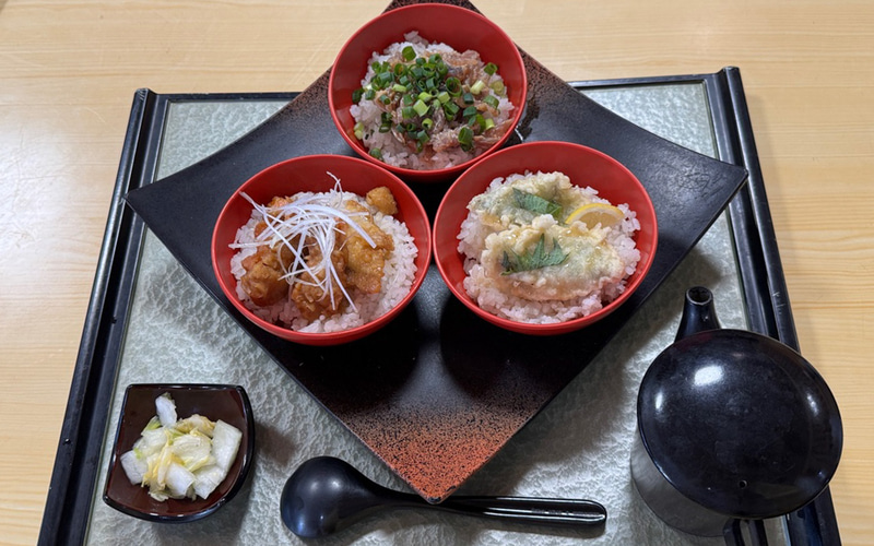 さらにさらに、菜な畑ロードからの帰り道にお昼ごはんを求めて走っていると、「おらが丼」というのぼりがいろんなお店に立ててあり、千葉鴨川おらが丼協会の看板まであるではないですか。これは気になる! ということで、駐車場が広くて200Vの普通充電器まで設置されている「房総美味いもの屋 藤よし」に入ってみました。このあたりの方言で「おらが」とは「わが家の」や「オレんちの」みたいな意味だということで、お店ごとに自慢のお料理を丼にして出しているのが「おらが丼」なんだそう。この藤よしのおらが丼は、鯵のたたき丼、金目鯛の生姜焼き丼、地魚の天丼の3種類が小さめの丼でセットになっていて、鯵のたたき丼はお出汁をかけてお茶漬けのようにしていただくこともできるんです。どれもすごく美味しくて、ボリュームたっぷりで大満足。また一つ、千葉に来たらリピートしたい名物が増えました。