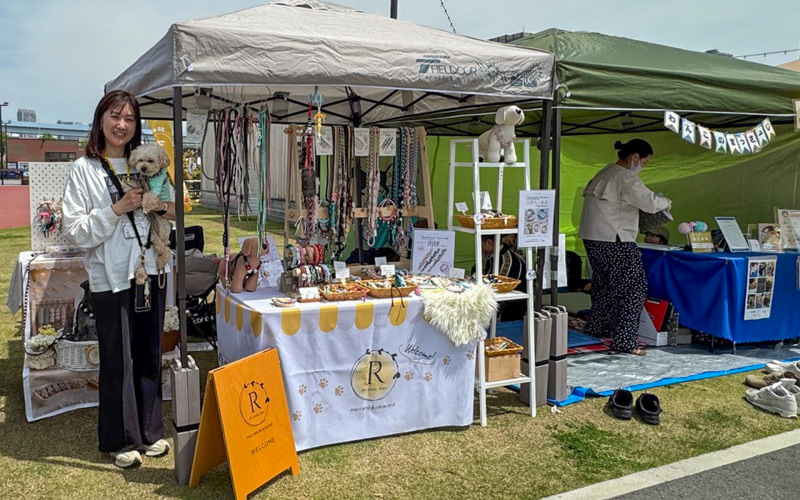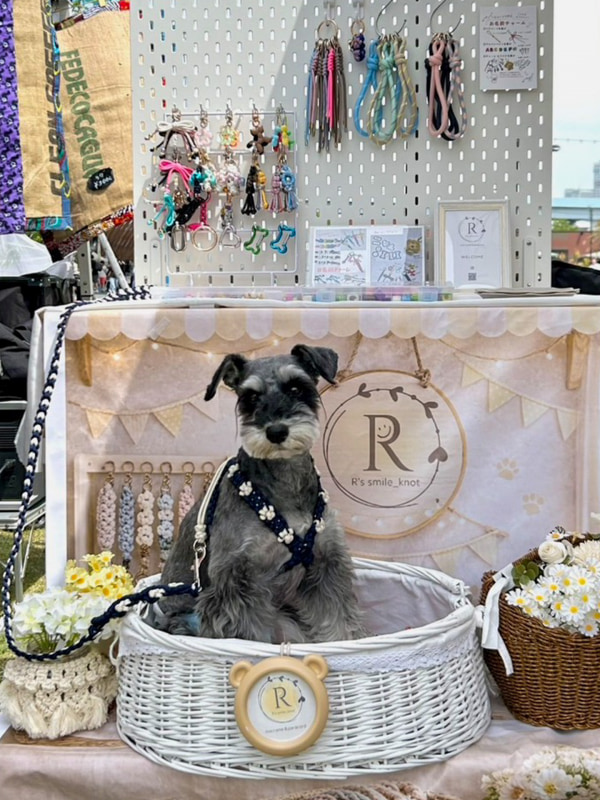 わが家のいちばんのお目当ては、私の妹が手がけるドッグアクセサリーのショップ「R's smile_knot(アールズ スマイルノット)」がマルシェに出店しているので、その陣中見舞いをすること。妹は昔から手先が器用でセンスがよく、部屋のインテリアの飾り付けとか、料理の盛り付けとか、なんでもステキに仕上げる天性の素質があるんですが、そんな妹がもともとはパラシュートの吊り下げ用に開発されたという丈夫なナイロン製のロープであるパラコードを使って、マクラメという編物の手法で制作する首輪やリード、迷子札チョーカーなどのグッズはとってもオシャレ。わが家の愛犬もお散歩デビューの時からずっと愛用していて、すごくいいんです。