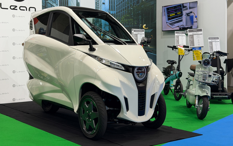「Lean3」は、前2輪操舵・後1輪駆動の3輪構造を採用。独自の「アクティブ・リーン・システム」により、車体を最適な角度に制御してコーナリングや荒れた路面でも安定した走行を実現させた。全長2470mm×全幅970mmの最小クラスのEVでありながら、航続距離100km、エアコンを標準装備するなど、従来の小型EVの課題を改善した。