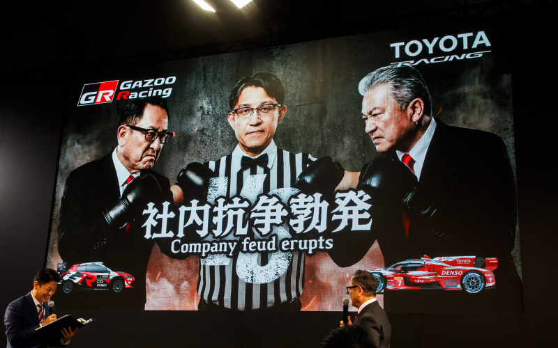 続いての勝負は「社内抗争勃発」。これは冒頭で説明したGAZOO RacingとTOYOTA RACINGの対決。ここで登場したのが「ジャイアーノ」ことトヨタ自動車 代表取締役副社長 執行役員 中嶋裕樹氏。同氏は「(モリゾウに頼らずに)いいクルマを作りたいエンジニアはたくさんいる」として、「GRとは袂を分かちTOYOTA RACINGを立ち上げる」と宣言。WEC(FIA 世界耐久選手権)で「モリゾウの力を借りずにトヨタのエンジニアだけで必ずル・マン24時間で優勝し、トロフィーをここに叩き付ける」と必勝を約束した。