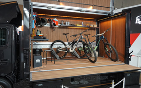 ウイングを開くと、中にはダウンヒルバイクのガレージをイメージしたものが登場。木目調の内装で荷物の固定や棚やフックの据え付けも可能な多目的仕様。ビジネスだけでなく多様な趣味やレジャーでの活用を想定したものとなる。可知氏は「バイクを運ぶだけでなく、ガレージそのものを運ぶという新しい提案」と述べた。