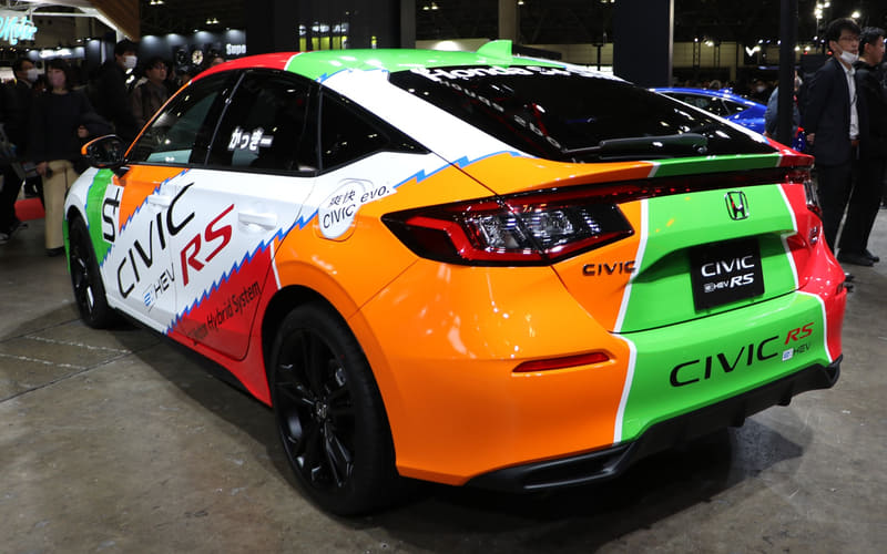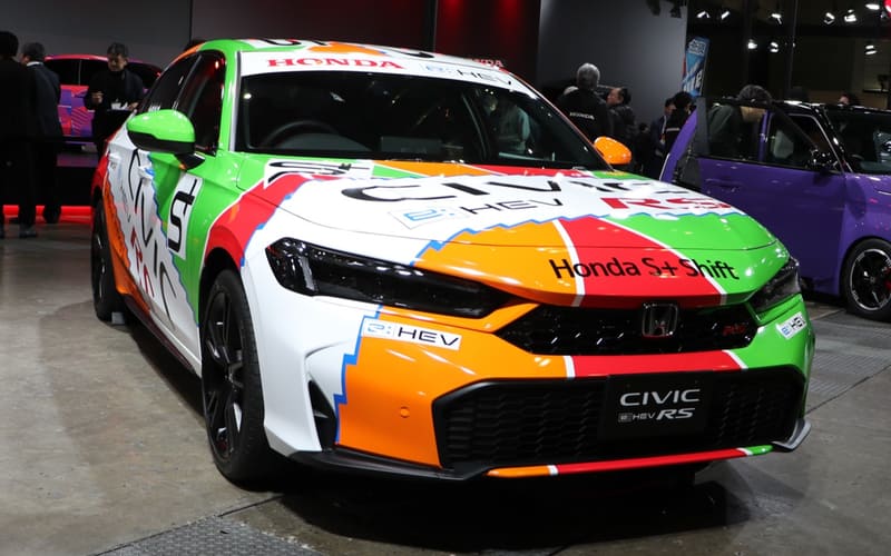 そのほかにも、新型プレリュードに搭載されるホンダ独自の2モーターハイブリッドシステム「S+Shift」を搭載した「シビック e:HEV RS」も出品。ボディカラーは約30年前に、当時のシビックが全日本ツーリングカー選手権に参戦してチャンピオンを獲得した時のカラーをオマージュすることで、スポーティなイメージを引き上げている。