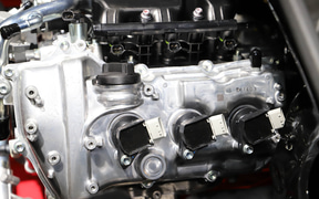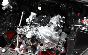 相原氏:エンジンのレイアウトは、これまでと同様にフロントミッドシップで、駆動方式はFRを採用しています。今回は、エンジンをこれまでより中央に寄せました。エンジンは前回同様の直列3気筒ですが、スラントして搭載することで機械損失を低減して、さらにフロントミッドシップ化することで通常は交換しにくくなるスパークプラグを替えやすくしました。タービンもアフターパーツのものと交換できるように、手の届きやすい場所に配置しています。また、これまでよりエンジンを中央に搭載したかったので、ホイールベースを55mm延長しました。横から見ていただくとつないでいる部分が分かるかと思います。