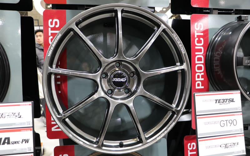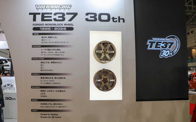 特に2026年はスポーツブランド「ボルクレーシング(VOLK RACING)」を代表する鍛造1ピースで軽量・高剛性ホイールの元祖ともいえる「TE37」が、誕生30周年を迎えたことから、初代モデルや30周年限定モデルを展示している。