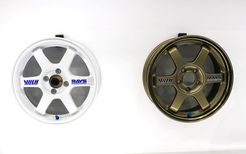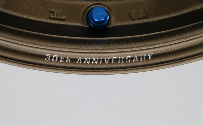 30周年記念モデル「TE37 30th Anniversary」は、当時と同じブロンズカラーとホワイトカラーの2色を設定。スポーク部分のロゴは、レイズの特許技術である「A.M.T.(ADVANCED MACHINING TECHNOLOGY)」による切削文字か、初代モデルと同じデカールを選択可能。デカールはブロンズにはブラック、ホワイトにはブルーとなる。