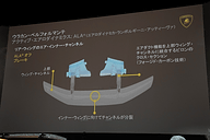それに対してALAでは、ウイング自体を動かすのではなく、ウイングステーに設けたエアインテークからウイング構造内部に走行風を取り入れ、その風を外に排出するときにウイングの上面、下面の風の流れに対して影響を与え、ウイング効果に変化を出すシステム。大がかりな装置が不要なので軽量で済むのも特徴となっており、デ・オト氏は「ランボルギーニはクルマの軽量化におけるリーディングカンパニーでもあるので、性能を求めるためとは言え重量を増やすわけにはいかなかった」と付け加える。