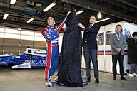 今回はボルグワーナーの日本法人となるボルグワーナー・モールスシステムズ・ジャパン 代表取締役社長 三島邦彦氏、ボルグワーナー マーケティング部長 スコット・ギャレット氏が佐藤琢磨選手とともに登場し、除幕を行なった。