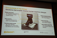 「コネクティビティ」ではインテリア部門 日本担当の青木英也氏が解説を実施。コンチネンタルでは「自動運転」による「ゼロアクシデント」、「電動化」による「クリーンパワー」といったメガトレンドの実現に向けた柱として「コネクティビティ」を捉えており、路車間通信、車車間通信などで情報を手に入れるほか、クルマを運転するドライバーとの関係性も含めた「包括的コネクティビティ」として取り組んでいると説明。