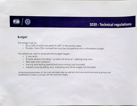 予算:2500万~3000万ユーロ(1ユーロ=128円換算で、約32億円~38億4万円)、現行のLMP1の約1/4(20~25%程度)
