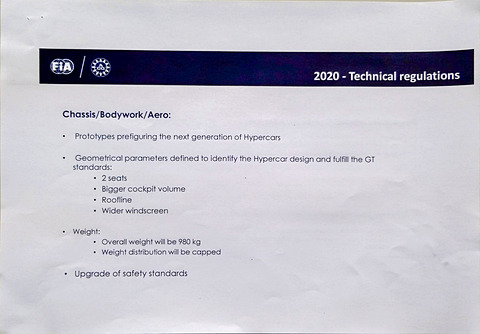 ACO CEO ピエール・フィヨン氏は「マニファクチャラーは新しいクルマに取り組むことができ、すべての車両がハイブリッドになる。その上でコストは現状LMP1の1/4になる。そしてこのルールは2020年から5年間継続して適用される」と述べ、新しいレギュレーションのコンセプトは環境に配慮して全車ハイブリッドにし、従来の1/4と低コストで、かつ5年間の継続性を約束したものになると要点を説明した。フィヨン氏によればこの新しいレギュレーションは「Hyper Car GT Prototype」と仮に呼ばれており、正式名称はファンにより決定してもらう予定だという。