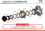 自動車用軸受もさまざまなものを製品化しており、ハブユニットもその一つになる。当初はハブまわりの小さな部品だったが、自動車メーカーの組立工数の削減、一体化による軽量化、ユニットによる性能ばらつき低減などにより、周辺部品と一体化。第3世代ハブユニットでは、ABS用のセンサーを内蔵し、シール装着・自己与圧保持によりメンテナンスフリー化を図っている。