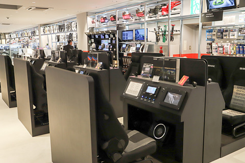 3階は体感を重視したスペシャリティエリアとして、チューニングやドレスアップにこだわった「Sports」と、車内音響にこだわった「Audio」のスペシャリティショップを展開。実際の座り心地を確認できるスポーツシートを多数取り揃えるとともに、クルマの運転席を模した着座方式のカーナビゲーション&スピーカーの試聴什器を採用した。さらに、約250車種、約200コースを登録し、振動や音を体感できる本格的なドライブシミュレーターを常設。料金は1000円/10分。