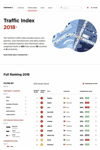 iOSのマップアプリなどに地図データを提供しているTomTom Internaionalは、世界各都市の交通渋滞の状況を報告する「トムトム・トラフィック・インデックス」の結果を同社のウェブサイトにて発表した。