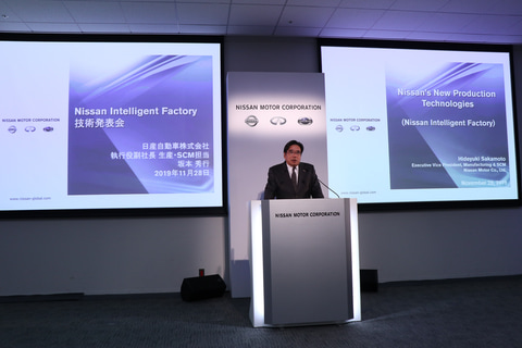 説明会では、日産自動車 執行役副社長 生産・SCM担当の坂本秀行氏が登壇。坂本氏は冒頭で「最近、自動車の技術の話ということになると、『自動運転のための知能化技術』『EVなどの電動化技術』『コネクテッドのための通信処理技術』といった話題が中心になっております。と、言いながら、私もそんな話をしている一味なのですが、決して忘れてはいけないのが、その技術のベースになる部分に生産技術、および生産管理システムと言いますか、関連する科学の力があることが極めて重要だと思っております。さらに、今後われわれが作っていく複雑で高度なクルマについて考えると、そんな生産技術の飛躍が明日の日産の飛躍のために要になると考えております」と語り、同日発表したニッサン インテリジェント ファクトリーが日産の将来にとって非常に重要であることを強調した。