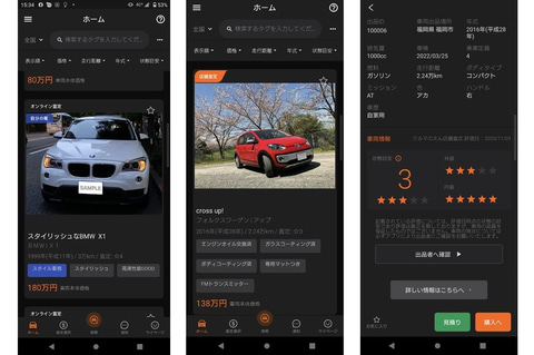 買い手は、出品車両が「店舗査定」または「オンライン査定」のどちらなのかをアプリホーム画面上に掲載されている車両写真左上のマークの表示によって確認できるとともに、クルマの内装や外装の状態についても5段階の評価でクルマの状態目安として確認可能。加えて、車両検索時には簡単検索機能により「スポーツタイプ」「アウトドア」「大人数が乗れる」といった購入希望車種の特徴や利用目的ごとにタグ検索ができ、求めているイメージに近いクルマを感覚的に探すこともできる。