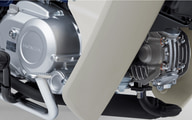 今回のモデルチェンジでは、最高出力5.9kW(8.0PS)/7500rpm、最大トルク8.8Nm/5500rpmを発生する空冷・4ストローク の単気筒OHC 109cm 3 エンジンを搭載。最大トルクと燃費性能の向上を図りながら最新の排出ガス規制に対応したほか、業務用途に合わせクラッチなど、内部部品のタフネス性も高められている。WMTCモード(クラス1)<1名乗車時>燃費は67.4km/L。