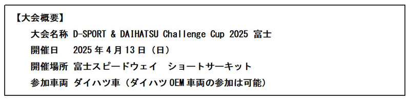 なお、D-SPORT&DAIHATSU Challenge Cup 富士の参加申し込みは2月25日0時から特設サイトで開始される。