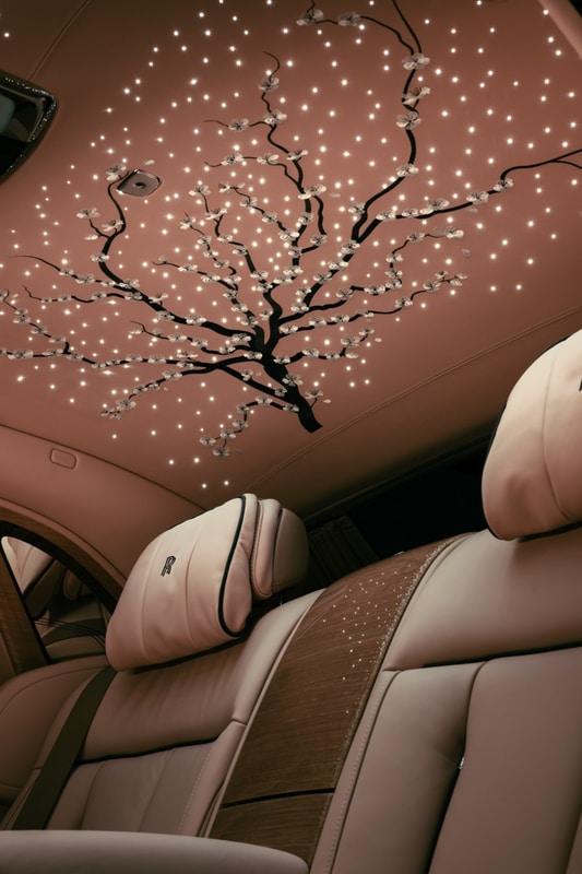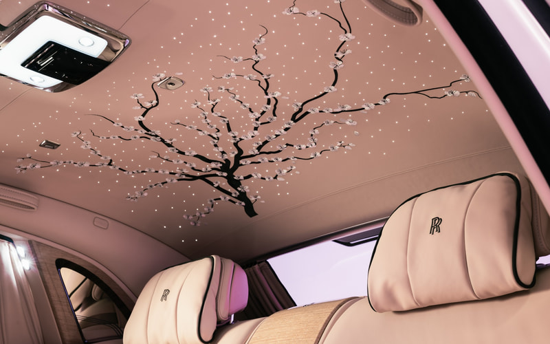特にヘッドライナーに刺繍された桜の木の豊かな質感は、日本の伝統的な技術にインスピレーションを得た「畳織り」を採用したといい、枝が絡み合い、互いに重なり合って伸びているように見える工夫が施されている。この立体的な視覚効果をつくり出すために、1人の職人が刺繍されたパネルを一点一点綿密につなぎ合わせ、車両の後部から後部座席の上へと流れるひと続きのデザインとなるよう仕上げている。ちなみに、このヘッドライナーの刺繍だけでも3週間、全体では6か月以上を要し、ステッチの総数は25万針以上という。