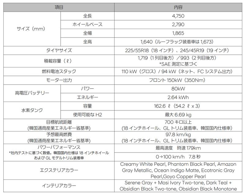 エクステリアは、大胆さと洗練さを融合させたFCEV特有のデザインで、ヒョンデの水素ブランド「HTWO」と「Hydrogen for Humanity(人類のための水素)」のメッセージを表現。夜間でもヒョンデブランドと分かる4つのドットランプを採用した。