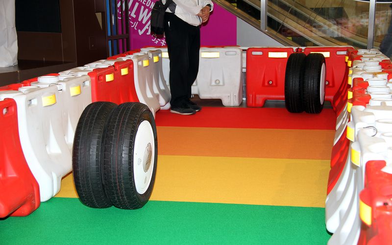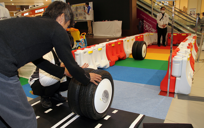 まずは、タイヤの空気圧を適正に保つことがいかに大事かを体験した。空気圧が低いタイヤと適正なタイヤを転がしてみると違いは歴然。空気圧が低いとクルマなら燃費が悪化するだろうし、自転車ならペダルが重くなるのはいうまでもなし。そのことが誰でも一目瞭然で分かるようにされていた。また、タイヤの溝が十分に残っていないと雨の日にすべりやすくなって危険なことを学べるコーナーも設けられていた。