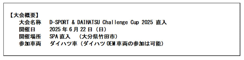 ダイハツ工業とSPKは、6月22日に「D-SPORT&DAIHATSU Challenge Cup 2025 直入」を、SPA直入(大分県竹田市)で開催する。