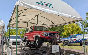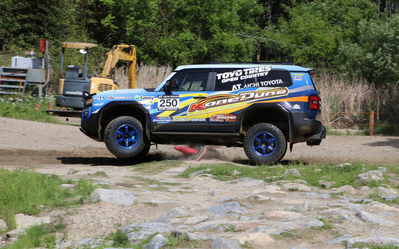 カーライフレボリューションK-one日進店の冨田裕一店長は、今回新たに制作したランクル250ラリーバージョンについて、「全日本ラリーの規定に沿って制作したマシンで、主な変更点はKYB(カヤバ)製サスペンションのK-oneオリジナル仕様、プロジェクトμ製ブレーキ関連パーツ、レイズ製ホイールなど。フロントにはオリジナルの4灯ランプを追加しています」と解説してくれた。