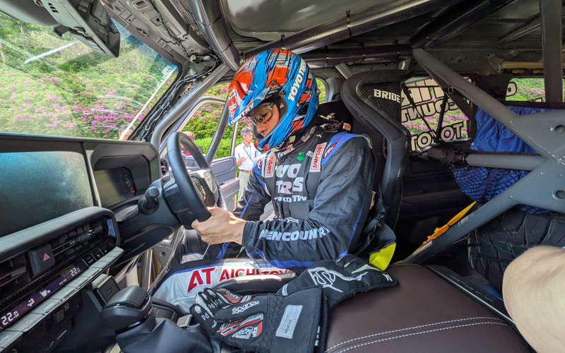 この日の最後には、メディア向けの同乗走行も実施。さなげアドベンチャーフィールドの林間コースを助手席で体験させていただいた。サーキットでの同乗は何度も経験があるが、オフロードコースの同乗は初めて。あくまで体験走行なので実際のレースよりもかなりペースを落としてくれているとはいえ、かなりの速度。途中で「え? この先ってコースなの?」と思うような狭い場所にもの凄い勢いで入っていき、まさにジェットコースターに乗っている感じ。動画を夢中で撮影したのであまり恐怖を感じなかったなぁと思いきや、クルマを降りたら膝がガクガクしていました。