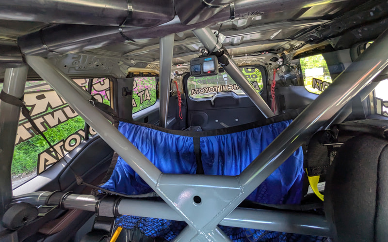 内装はフロアやルーフの内張は剥がされているものの、ドアパネルなどはそのまま。シートはBRIDE製のフルバケットシートで、6点式ベルトも装備。ロールケージは完全なオリジナルで、レギュレーションに沿った部材と直径のパイプを使用している。後席にはヘルメットを置くネットと、スペアタイヤやジャッキなど工具も搭載されている。