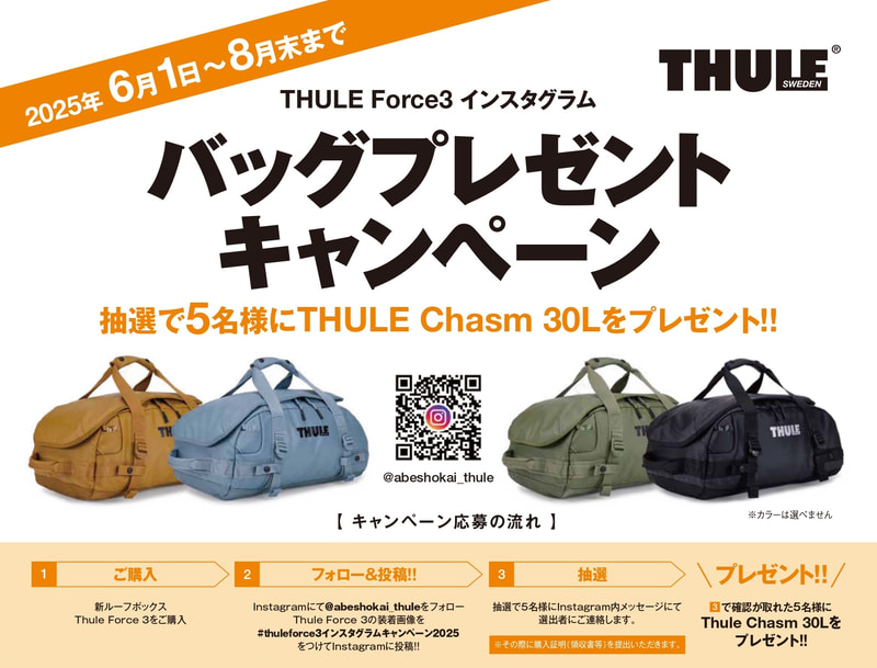 また阿部商会では、「フォース3」の発売を記念して、6月1日~8月31日まで「バッグプレゼントキャンペーン」を実施。応募方法は、新製品の「フォース3」を購入して、Instagramにて公式アカウント「@abeshokai_thule」をフォローしたうえで、「フォース3」の装着画像をハッシュタグ「#thuleforce3インスタグラムキャンペーン2025」をつけてInstagramに投稿するだけ。抽選で5人にいろいろな用途に使えるバッグ「THULE Chasm 30L」が当たる。