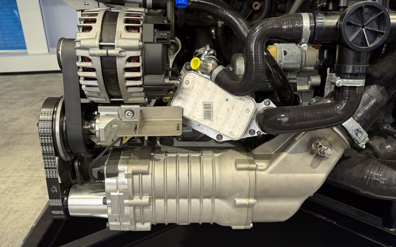 一方、水素の空燃比は34.3で、従来のエンジンに対して1.5倍から2倍の空気量がストイキ燃焼において必要となる。これはそれだけの空気量をエンジンに送り込む必要があり、ボッシュはそのためにコンプレッサーとターボチャージャーを用意した。