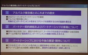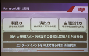 トヨタアルバルク東京からパナソニックへの期待するものとして、「エスコンフィールドHOKKAIDO」「阪神甲子園球場」「FLAT HACHINOHE」といった導入実績にみる、国内大規模スポーツ施設での豊富な累積された経験値、エンターテイメントを向上させる付加価値提案から、高精細&高音質の製品力、総合演出システムによる演出力、理想の演出空間の実現に向けた空間設計力にあるという。