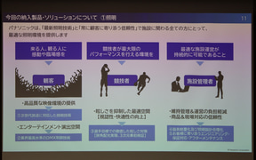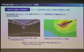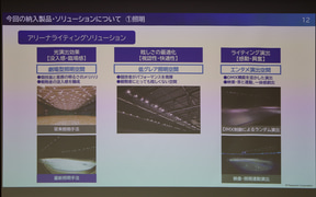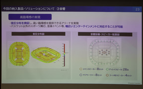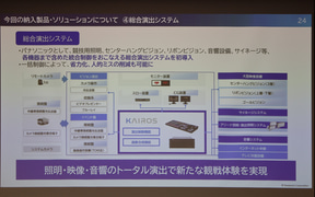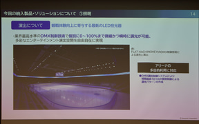 パナソニック エレクトリックワークス社の稲継氏は「これまでは他社さまが納入された機器と連動させた総合演出を行なってまいりましたが、今回のアリーナでは、初めてトヨタアリーナ東京内の照明、音響、センタービジョン、リングビジョン、リボンビジョンなど、演出機器を全て当社よりご提案、導入させていただきました。これにより、当社として提案する初の総合演出ソリューションが実現可能となりました」と説明。