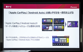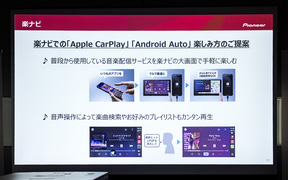続いて登壇したパイオニア マーケティング推進部 国内マーケティング課の堤大士氏は楽ナビについて説明。まず、楽ナビは常に「その時代時代のカーライフをどう充実させていけるか」を追求し続けてきた商品だと前置き。今回の商品は「カーナビやスマホのいいところを生かして共存していくことでカーライフを充実させていくことがコンセプト」として、全機種がApple CarPlayおよびAndroid Autoに対応しつつ、オーディオ機能の充実化に注力。地図との2画面表示やオーディオ画面へのスムーズな遷移、音声入力による楽曲選択など、分かりやすさや使い勝手をアップさせていると述べた。