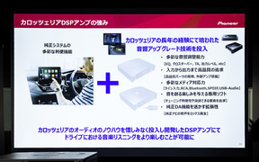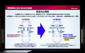通常、純正システムはスピーカーをマルチチャンネル化しているものの、調整できる幅が限られていることから音源の意図に沿ったリスニング環境が得られにくいと課題を挙げる一方、DSPにより「タイムアライメントと一緒に独立EQ調整、独立レベル調整、クロスオーバー調整などの洗練された機能によって音像音場を明確に作り上げることができる」と解決方法を示した。