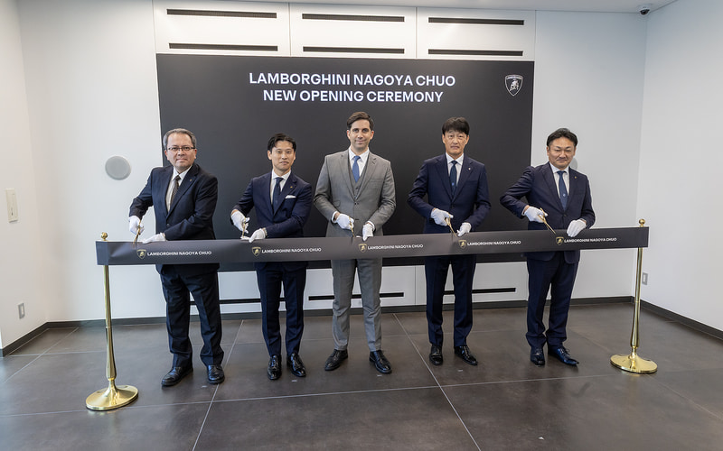 ランボルギーニ名古屋はアウトモビリ・ランボルギーニとコリーダモータース(GLIONグループ)が正規販売代理店契約を結び運営する中部エリアで唯一の正規販売代理店である。今回のオープニングセレモニーには、アウトモビリ・ランボルギーニからHead of Japanのパオロ・サルトーリ氏とコリーダモータース代表取締役会長の宮本輝夫氏、そしてランボルギーニ名古屋中央のゼネラルマネージャーである木村仁氏が登壇した。