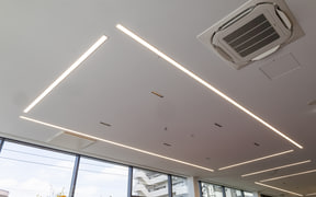店舗の内装やデザインは、アウトモビリ・ランボルギーニの定める最新CIに沿ったもので、建屋の1階には3台の展示車が置けるショールームや商談、整備の打ち合わせなどのためのスペースが設けられている。
