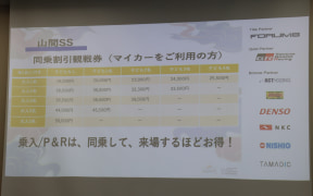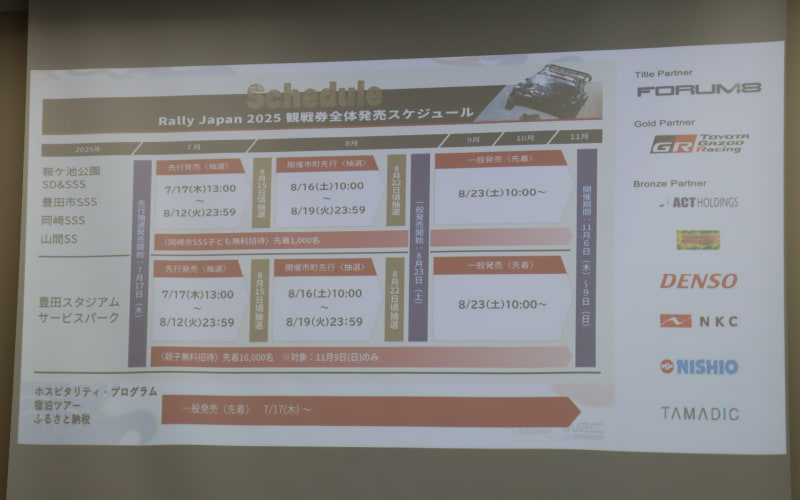 同日から一部の先行販売を開始した観戦チケットなどの紹介は小坂副会長が担当。まずは抽選となる先行販売が8月12日まで行なわれ、8月16日~19日の4日間にはラリーが行なわれる地元住民を対象とした「開催市町先行販売(抽選)」の申し込みを受け付け、8月23日から先着順となる一般販売がスタートする。
