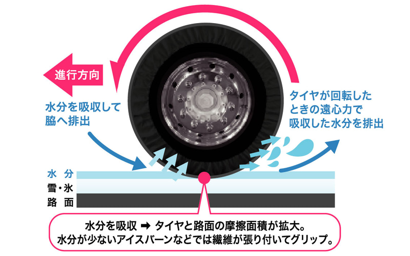 スベーネには、特許取得済の2種類の織り方を1枚の布で実現する技術を採用。この技術により、裏表の縫い目がないシームレスな構造を可能としている。これにより、タイヤへの密着性を高め、走行中のズレや浮き上がりを効果的に抑制する。また、この技術は「装着時の布の重なり(ギャザー)」の軽減にもつながっており、摩耗が減り、布へのダメージを最小限にしている。