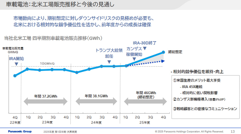 和仁古グループCFOは「2024年度は、IRA準拠となっている米国内で生産するパナソニック製セルの優位性を、戦略パートナー(テスラ)にもしっかりと評価してもらい、四半期ごとに販売量を拡大していった。その流れを受け、2025年度の期初時点では、戦略パートナーからのデマンド情報を勘案し、46GWhという年間販売見通しを公表した」とした上で、「その後、米国関税政策の急速な変更や、EV購入者に対する補助政策(IRA 30D)の廃止などが重なり、短期的には需要の一定の減速は避けられない見通しになっている。期初の状況よりは軟化せざるを得ないと判断している。また、IRA 30Dが需要に対して、どれぐらいの影響があるのかといったことにも注視しているところである」とした。