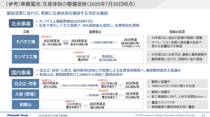 パナソニックエナジーでは、車載電池生産のカンザス工場を、当初計画を前倒しする形で2025年7月から稼働させているが、2026年度末(2027年3月)としていた32GWhでのフル生産への移行時期を未定と発表。「北米EV市場のデマンドが減速することを踏まえたものであり、当初の計画よりは後ろ倒しになる」と述べた。