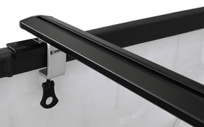 ルーフボックス、ルーフラック、サイクルキャリアなどのアタッチメントに対応。ルーフより低い位置に積載できるため、積み下ろしが簡単に行なえる。アタッチメントは、バーの溝にT字型のボルトを差し込み、後付け感のない見た目で取り付けられるTスロットと、金具でバーを上下から挟み、取り付け・取り外しが簡単な上下クランプ取り付けに対応する。