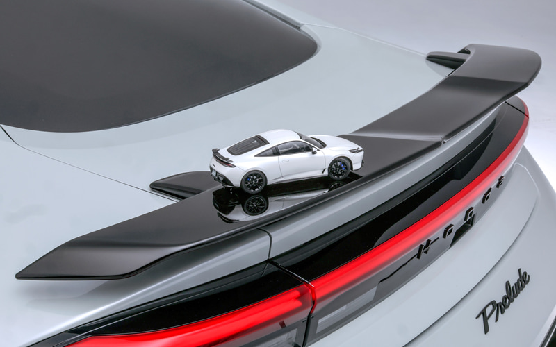 新型プレリュード用のテールゲートスポイラーは、グライダーの翼を彷彿とさせる立体感のある造形で、プレリュードのスポーティーなスタイリングをさらに引き立てる、ホンダ純正アクセサリーラインアップの目玉アイテムとされている。