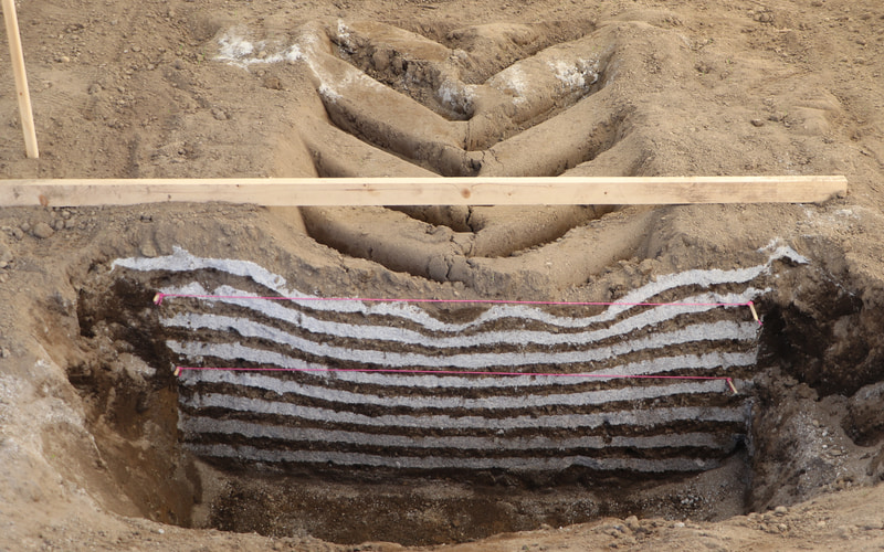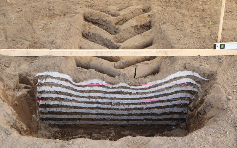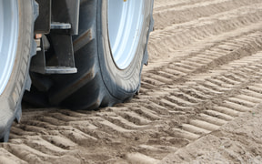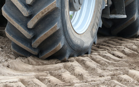 軸重をそろえた2種類のタイヤで圃場を走行し、土壌の圧縮を比較。走行後の地面を掘り起こして確認してみたところ、VFタイヤの「AXIOBIB 2」は圃場を広く浅く踏むため、土壌の沈み込みが浅いことが実証された。標準タイヤとの沈み込み差は1cmほどだが、広大な敷地の圃場すべてが1cm圧縮されれば、その損失は圃場が広ければ広いほど大きくなる。