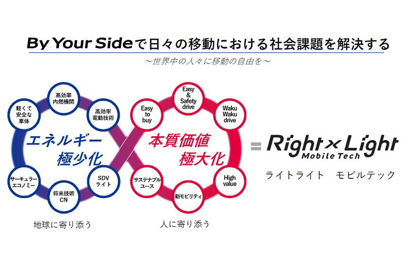 生活に密着したインフラモビリティ企業として、従来の行動理念「現場・現物・現実(3現主義)」に加え、「原理・原則(2原)」を取り入れた「3現・2原」を新たに掲げ、地球に寄り添う技術哲学で「エネルギー極少化」、ヒトに寄り添う技術で「本質価値極大化」を実現し、「Right x Light Mobile Tech(ライトライト モビルテック)」としてユーザーに寄り添う価値を提供していく。