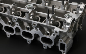 シリンダーヘッドSUB-ASSY:燃焼室に切削加工を追加し、鋳肌をそのまま残した部分の面積を減らすことで、圧縮比のばらつきから生まれるエンジンごとの個体差を低減。吸気ポートには塗型処理を施し、未加工の状態での表面の凹凸を軽減。オリジナル部品では、一部のみで使用していたカムキャップのノックピンを全か所に追加することで、組付時の作業性を改善している。